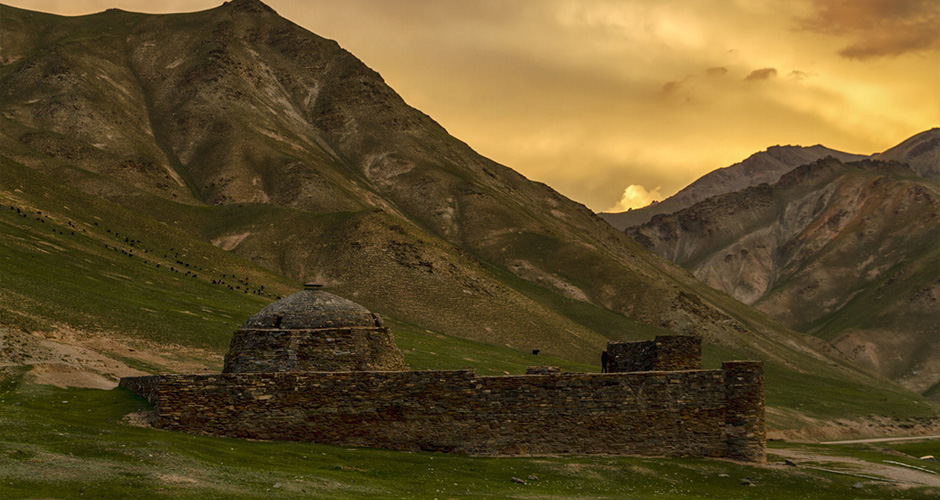 Nous atteignons le camp en empruntant une piste serpentant au coeur de gorges et de vallées alpestres où paîtrent des troupeaux de Yaks. En fin d’après-midi visite du caravansérail fortifié de Tash Rabat niché au fond d’une petite vallée et lieu de passage sur la fameuse route de la soie. Camp sous yourte (marche 3h)