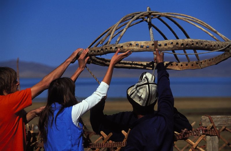 Route pour la passe de Tyuz Ashuu (3500 mètres). Une fois le tunnel de la passe franchi, un magnifique panorama s’offre à nous. Nous laissons notre véhicule sur les flancs de la vallée de la Sussamyr et partons à la rencontre des nomades kirghizes et des fameuses yourtes en feutre. Camp sous tente sur les bords de la rivière Sussamyr ( marche 2h)