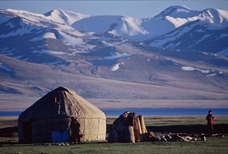 Nous prenons la direction de Chaek petit village planté au milieu d’une vallée aride (transfert en camion). Après une halte pour faire le plein de vivres et d’essence nous reprenons la route qui mène au lac Song Koul. 2 heures de route pour atteindre la passe Karakeche. Devant nous le lac Song Koul et des dizaines de yourtes installées pour la belle saison dans ce paradis de nature. Camp au bord du lac et nuit sous yourte (alti 3130 m).