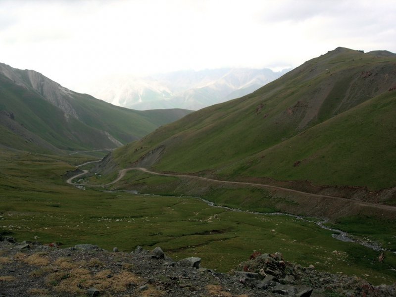 Pour sortir de la « cuvette » de Song Koul il nous faut gravir la passe Kalmashu (3512 m) et approximativement 500 m de dénivelé. Une fois atteinte, une descente vertigineuse nous attend pour rejoindre la vallée et le village de Sary Bulac ( 2 800 m). Le paysage a changé, la région se fait beaucoup plus aride. Nuit sous tente près de la rivière Karakol.