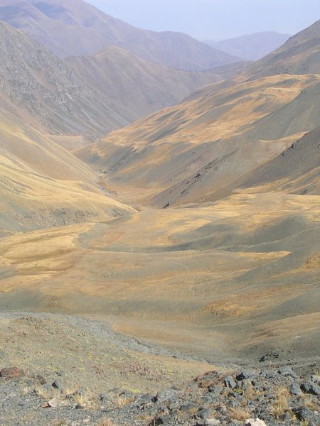 Nous contournons le massif de Sandyk, longeons la rivière pour la passe de Saryk (3540 mètres). Les sommets de Song koul sont maintenant très proches. Descente vers le Jailoo de la vallée de Joumgal, autre région de pâturage où sont installés les nomades. Camp au bord de la rivière Keldy-Sou (7 à 8 h de marche).