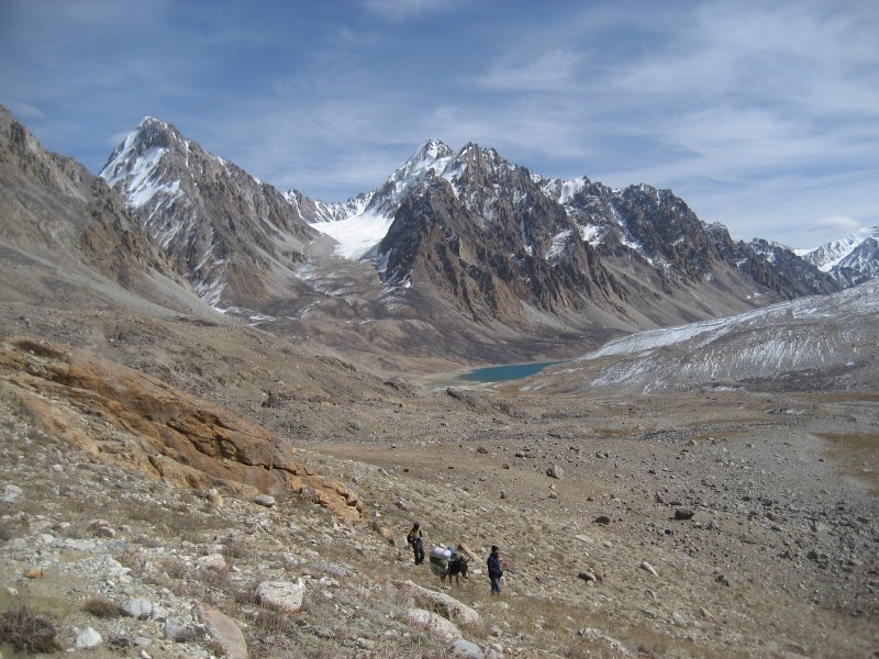 La végétation est quasi inexistante malgré tout nous croisons quelques troupeaux de moutons, yaks garder par de téméraires bergers. Bergers surveillant attentivement leurs bêtes car si la faune est difficilement accessible elle reste le principal danger des troupeaux. Ces montagnes sont le lieu de vie des léopards des neiges, ours, loups, bouquetins … Les pamiris montent dans ces alpages mi juillet avant de repartir fin septembre et l’arrivée des premières neiges et du froid glacial. Car ici comme l’on décrit de nombreux explorateurs nous sommes dans le Pamir « le toit du monde » et la vie y est rude très rude. La vaste étendue d’eau couleur émeraude du lac Yashykoul sera l’objectif, nous l’atteindrons au sixième jour de notre trek.